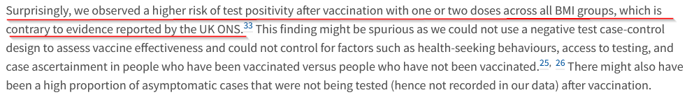 Οι συγγραφείς, σε αντίθεση με άλλες μελέτες, αναγνώρισαν τις αρνητικές επιπτώσεις, γράφοντας: “Παραδόξως, παρατηρήσαμε υψηλότερο κίνδυνο θετικότητας του test μετά τον εμβολιασμό με μία ή δύο δόσεις σε όλες τις ομάδες ΔΜΣ, γεγονός που έρχεται σε αντίθεση με τα στοιχεία του ONS του Ηνωμένου Βασιλείου”.