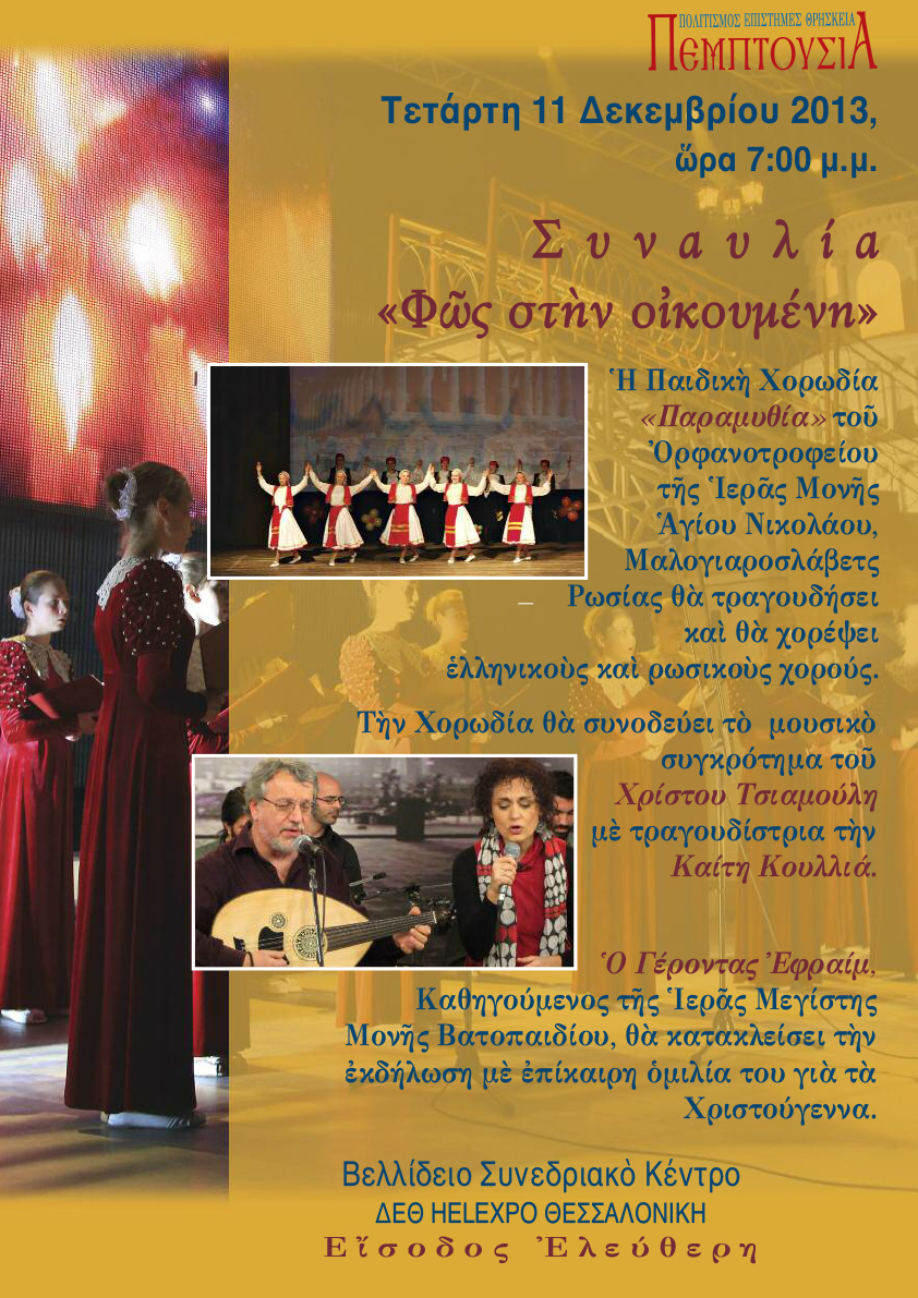 Το διαδικτυακό περιοδικό Πεμπτουσία www.pemptousia.gr διοργανώνει Συναυλία με τον τίτλο «Φως στην οικουμένη» την Τετάρτη 11 Δεκεμβρίου 2013 και ώρα 7:00 μ.μ. στο Βελλίδειο Συνεδριακό Κέντρο της ΔΕΘ HELEXPO στη Θεσσαλονίκη.