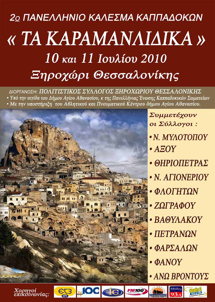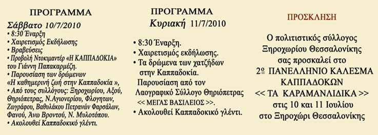 25 Ιανουαρίου 2012 σε ΑΝΑΚΟΙΝΩΣΕΙΣ ΠΑΛΑΙΕΣ Ο ΠΟΛΙΤΙΣΤΙΚΟΣ ΣΥΛΛΟΓΟΣ ΞΗΡΟΧΩΡΙΟΥ ΘΕΣΣΑΛΟΝΙΚΗΣ ΣΑΣ ΠΡΟΣΚΑΛΕΙ ΣΤΟ 2ο ΠΑΝΕΛΛΗΝΙΟ ΚΑΛΕΣΜΑ ΚΑΠΠΑΔΟΚΩΝ <<ΤΑ ΚΑΡΑΜΑΝΛΙΔΙΚΑ>> ΣΤΙΣ 10 ΚΑΙ 11 ΙΟΥΛΙΟΥ 2010 ΣΤΟ ΞΗΡΟΧΩΡΙ ΘΕΣΣΑΛΟΝΙΚΗΣ Επόμενο Προηγούμενο