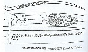 Τον 19ο αιώνα ένας Ιταλός πρέσβης στην Κωνσταντινούπολη συγκέντρωσε μια ιδιωτική συλλογή όπλων και πανοπλιών, που την εξέθεσε αργότερα στο Τορίνο. Ανάμεσα στα αντικείμενα ήταν και ένα ξίφος σκαλισμένο με Χριστιανικές φιγούρες και με ελληνιστί αφιέρωση σε έναν Αυτοκράτορα ονόματι Κωνσταντίνο. Το 1857 ο Γάλλος Βικτόρ Λανγκλουά το εξέτασε και αποφάνθηκε, πως ήταν το ξίφος του Κωνσταντίνου, προερχόμενο από τον τάφο του Μωάμεθ Β´