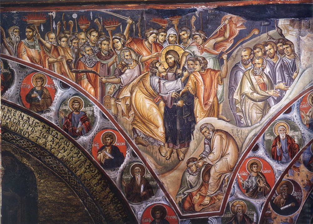 Κάποια στιγμή ακούστηκαν φωνές και θόρυβος πολύς. Έφτασαν οι στρατιώτες με οδηγό τον Ιούδα για να συλλάβουν τον Ιησού. Χαρακτηριστικό σύνθημα ο ασπασμός του Διδασκάλου από τον Προδότη (Λουκ.22:48). Ο Πέτρος χρησιμοποιεί βία, κόβει το αφτί του στρατιώτη Μάλχου (Ιωάν.18:11). Παρ’ όλα αυτά η σύλληψη πραγματοποιείται. Ο Κύριος δέσμιος οδηγείται σε ολονύκτιες ψεύτικες δίκες για να καταδικαστεί και να σταυρωθεί.