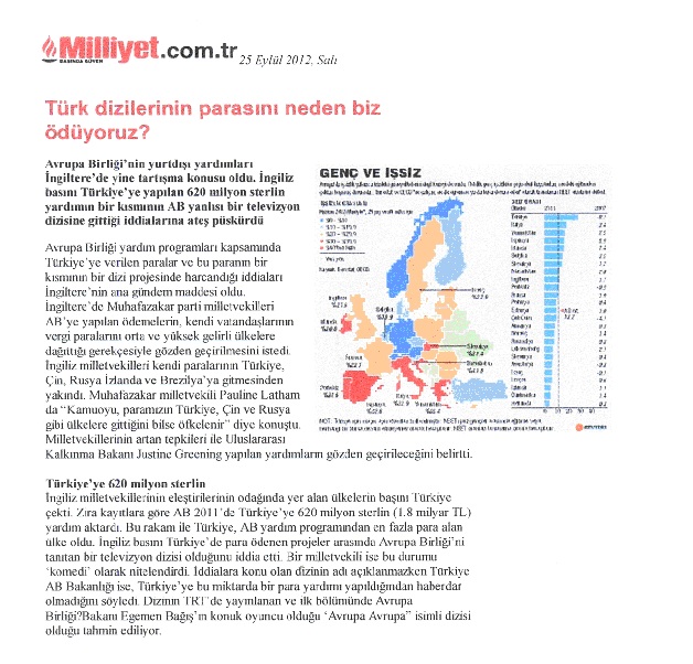 Την καταπληκτική καταγγελία ότι με χρήματα της Ευρωπαϊκής Ένωσης γυρίζονται κάποιες πολύ γνωστές τουρκικές τηλεοπτικές σειρές, που στη συνέχεια πλημμυρίζουν κάποιες χώρες της Ευρώπης μεταξύ των οποίων και η Ελλάδα, έκανε η βρετανίδα βουλευτής του βρετανικού συντηρητικού κόμματος, Pauline Latham. Μάλιστα η είδηση αυτής της καταγγελίας προκάλεσε τόσο μεγάλη αίσθηση, που πέρασε και στον τουρκικό τύπο, με αποκλειστικό δημοσίευμα της τουρκικής εφημερίδας Μιλιέτ.