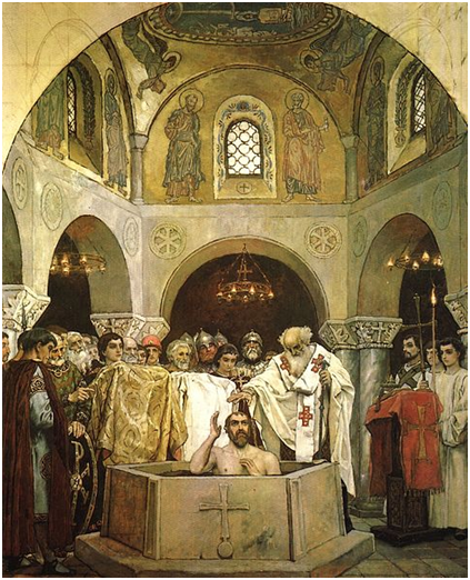 (…) Βαφτίστηκε ο Βλαδίμηρος στην Εκκλησιά του Αγίου Βασιλείου, μπροστά στους συναγμένους πρωτάρχοντες τις χώρας του -“Βογιάρους” τους λένε στην Ρωσία- και το σπίτι του Θεού αντήχησε από την θεία ψαλμωδία. Βαφτίστηκε ο Βλαδίμηρος και μαζί με αυτόν και εκατό ακόμα άρχοντές του…