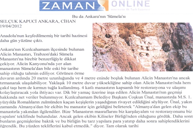 Το τουρκικό δημοσίευμα της τουρκικής εφημερίδας Ζαμάν, στις 19 Απριλίου, με το οποίο έγινε γνωστή η «αποκάλυψη» του μοναστηριού που μοιάζει πολύ με την Παναγία Σουμελά στην περιοχή της Άγκυρας. Στο δημοσίευμα παρατίθεται και μια ενδεικτική φωτογραφία της ιστορικής χριστιανικής μονής που περίμενε επί αιώνες για να έρθει στο φως της δημοσιότητας.