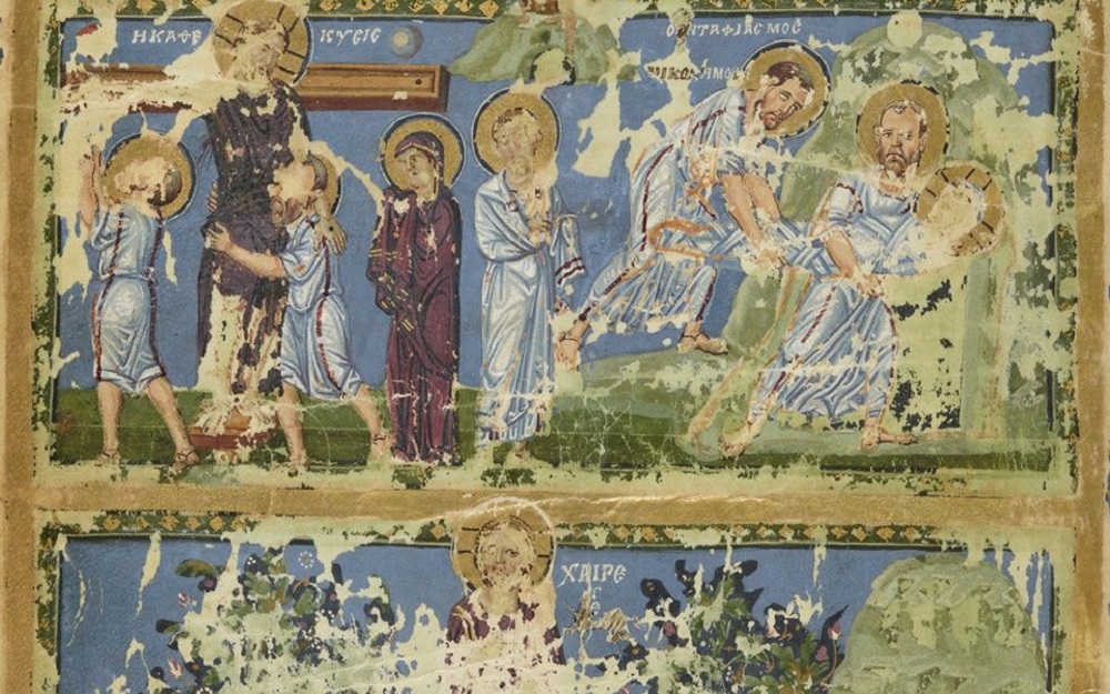 Αυτό, άλλωστε, επιχειρεί να κάνει και ο Ναζιανζηνός στον ρητορικά φορτισμένο λόγο του για το Πάσχα, τον οποίο διακοσμούν αυτές οι παραστάσεις. Σε ένα χαρακτηριστικό απόσπασμα, οι σκηνές της μικρογραφίας συνδυάζονται εμφατικά με τη συμμετοχή των πιστών: «Χθες συνεσταυρούμην Χριστώ, σήμερον συνδοξάζομαι· χθες συνενεκρούμην, συζωοποιούμαι σήμερον· χθες συνεθαπτόμην, σήμερον συνεγείρομαι». («Χθες σταυρωνόμουν μαζί με τον Χριστό, σήμερα δοξάζομαι μαζί Του. Χθες νεκρωνόμουν, σήμερα ζωντανεύω μαζί Του. Χθες ενταφιαζόμουν, σήμερα ανασταίνομαι μαζί Του»).