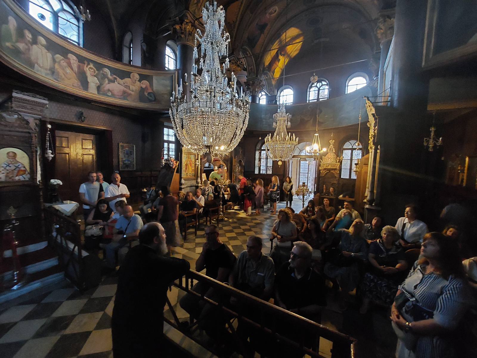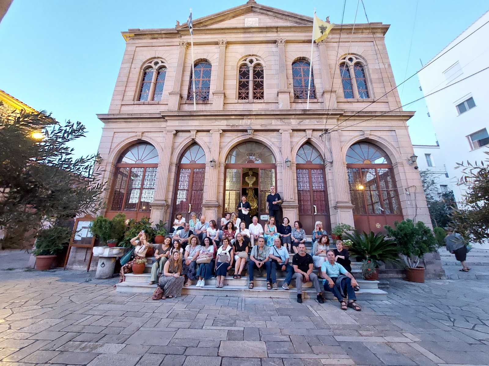 Εσπερινός στον κεντρικό ναό με τον τάφο του Αγίου Ραφαήλ να αποτελεί επίκεντρο προσκυνηματικό, όπως και στο ναό, κάτω από το καθολικό, τα Χαριτόβρυτα λείψανα των Αγίων Νικολάου και Ειρήνης. Το υπόλοιπο της βραδιάς αφιερώθηκε στην πρώτη γνωριμία με την πόλη της Μυτιλήνης, τα υπέροχα αρχοντικά, σε ένα συνδιασμό αρχιτεκτονικής ντόπιας και δυτικής προέλευσης, το αρχοντικό διαμονής του πολυβραβευμένου ποιητή μας Οδυσσέα Ελύτη και τον πολιούχο της Άγιο Θεόδωρο τον Βυζάντιο.