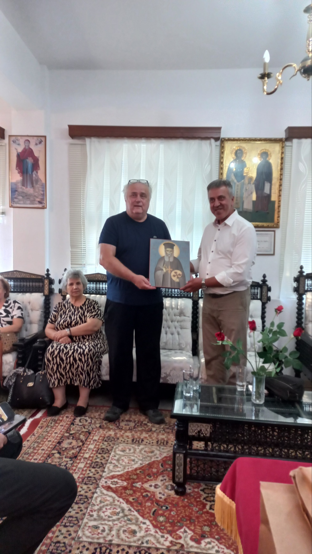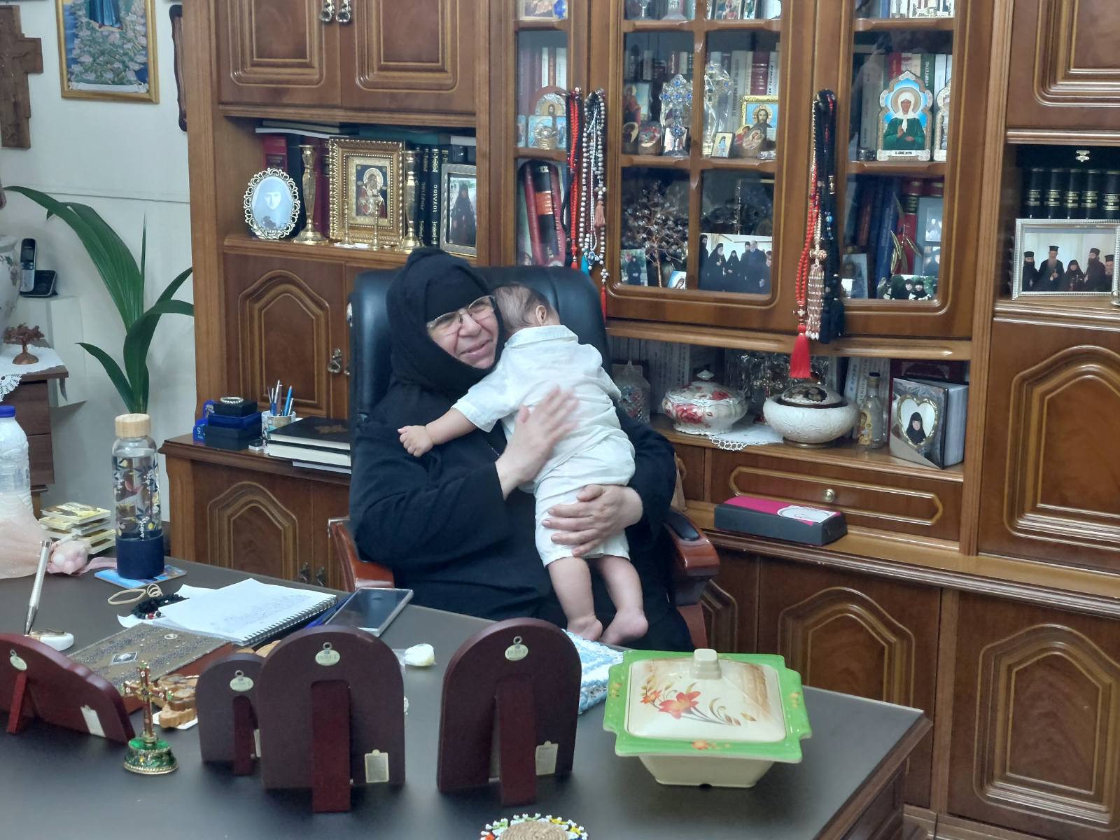 Όλοι μαζί μεταβήκαμε ακολούθως στο ηγουμενείο, που μας δέχθηκε η γερόντισσα Ταβιθά με πολύ αγάπη και προσφέραμε σε ένδειξη ευγνωμοσύνης για την φιλοξενία, εικόνα του προστάτη της πόλεως των Πατρών, Αγίου Ανδρέα του Πρωτοκλήτου, λαμβάνοντας αντίστοιχα την ευχή της και πολλά αναμνηστικά για ευλογία.