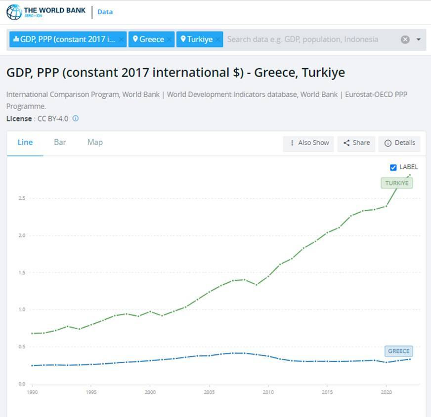 Εικόνα 2: ΑΕΠ σε όρους ισοτιμίας αγοραστικής δύναμης Τουρκίας και Ελλάδας (1990-2022).