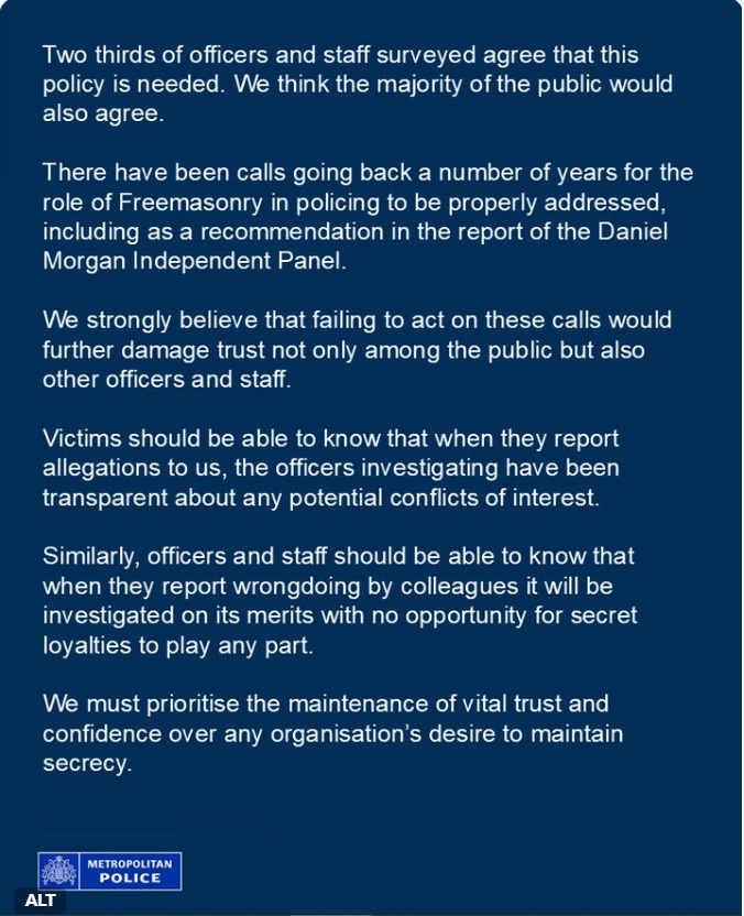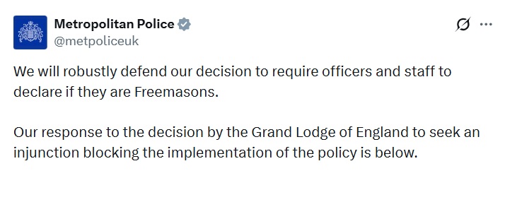 Αξιοπερίεργη εξέλιξη! Η Μητροπολιτική Αστυνομία του Λονδίνου @metpoliceuk ζήτησε, με εσωτερική διαταγή να δηλώσουν αξιωματικοί και προσωπικό εάν είναι Ελευθεροτέκτονες, θεωρώντας ότι μέσα στο Σώμα ” ..η ζωτική εμπιστοσύνη και εμπιστευτικότητα πρέπει να προηγούνται κάθε οργάνωσης που επιθυμεί να διατηρεί τη μυστικότητα” Θυμίζω ότι αντίστοιχη διάταξη είχε προβλεφθεί πριν κάποια χρόνια για τους Ιταλούς Δικαστές μέχρι που ένας τιμωρηθείς Ελευθεροτέκτων δικαστής προσέφυγε στο Δικαστήριο Δικαιωμάτων του Ανθρώπου και αυτό τον δικαίωσε (Υπόθεση Maestri κατά Ιταλίας 2004). Στη χώρα μας ο #Καποδίστριας με την εγκύκλιο 4286 της 22-8-1831 είχε θεσπίσει ασυμβίβαστο για τους Δημοσίους Υπαλλήλους με το να είναι μέλη μυστικών εταιριών, επί ποινή απολύσεως. 36 ημέρες μετά δολοφονήθηκε.