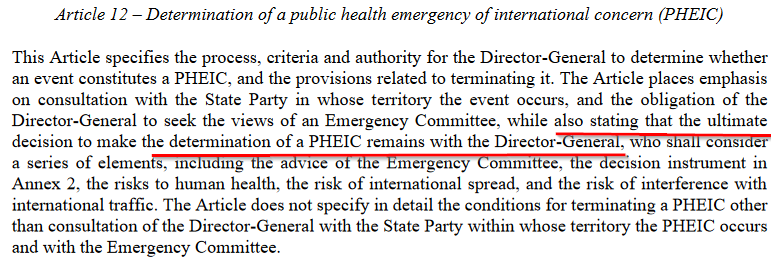 Μόνο ο Γενικός Διευθυντής του ΠΟΥ αποφασίζει πότε προκύπτει μια παγκόσμια κατάσταση έκτακτης ανάγκης για την υγεία (άρθρο 12, γραμμή 1 της IHR) και τελειώνει μόνο όταν το αποφασίσει ο Γενικός Διευθυντής.
