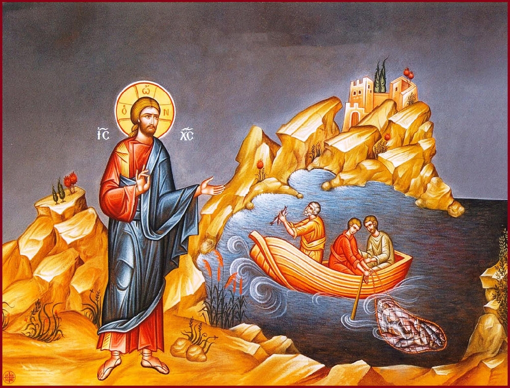 Σύμφωνα με τη διήγηση του Ματθαίου, ο Κύριος καθώς βάδιζε στην παραλία της λίμνης της Τιβεριάδος συνάντησε τον Ανδρέα και τον Πέτρο και στη συνέχεια τον Ιάκωβο και τον Ιωάννη, που ήταν ψαράδες και την ώρα εκείνη κατάρτιζαν τα δίχτυα τους. Tότε απηύθυνε σ’ αυτούς την πρόσκληση: «Δεύτε οπίσω μου και ποιήσω υμάς αλιείς ανθρώπων». Ακολουθήστε με και θα σας κάνω ικανούς να ψαρεύετε ανθρώπους. Και αυτοί αμέσως, χωρίς χρονοτριβή, εγκατέλειψαν τα πάντα και τον ακολούθησαν.