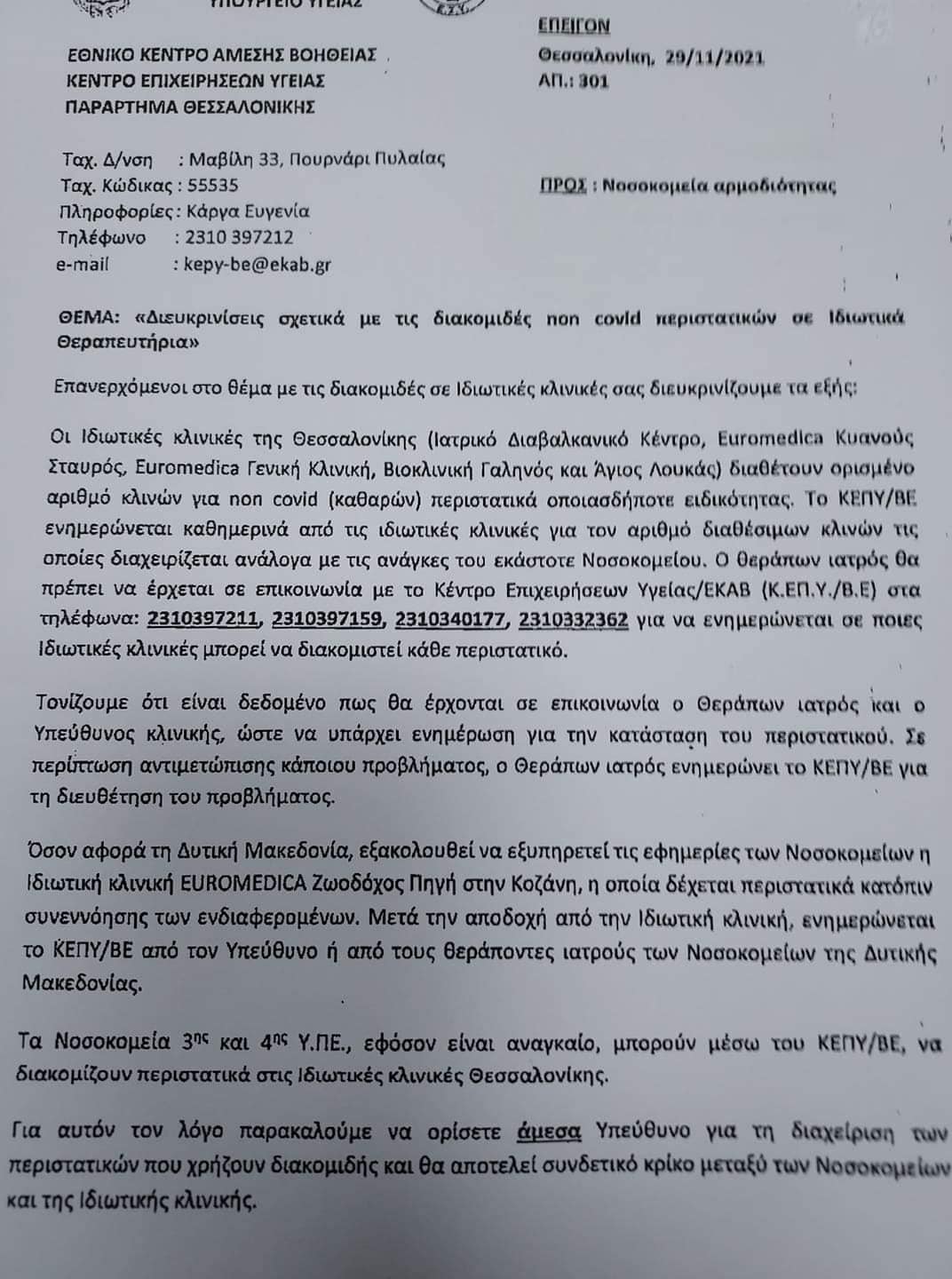 Στο έγγραφο συστήνεται ο θεράπων ιατρός κάθε ασθενή (δημόσιου νοσοκομείου), να έρχεται σε επικοινωνία με το Κέντρο Επιχειρήσεων του ΕΚΑΒ, ώστε να κανονίζεται η διακομιδή του σε κάποια ιδιωτική κλινική, εφόσον το δημόσιο νοσοκομείο δεν έχει διαθέσιμη κλίνη ή γιατρό ανάλογης ειδικότητας.