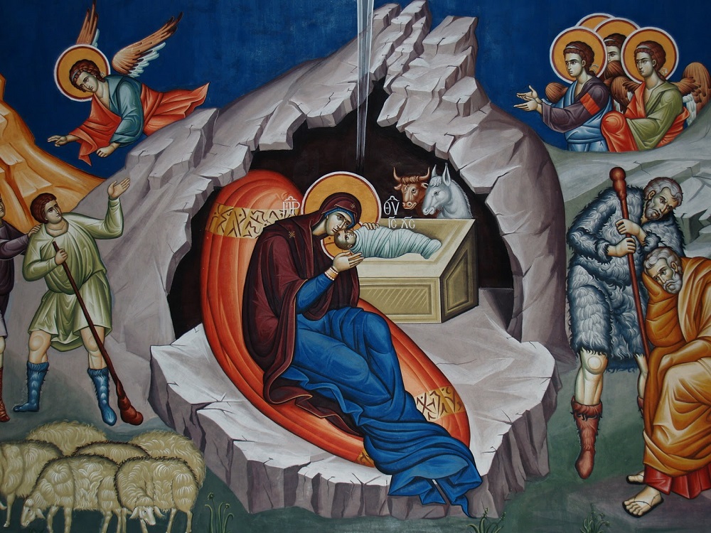 Μυστήριον ξένον ὁρῶ καὶ παράδοξον! οὐρανὸν τὸ σπήλαιον· θρόνον Χερουβικὸν τὴν Παρθένον· τὴν φάτνην χωρίον· ἐν ᾧ ἀνεκλίθη ὁ ἀχώρητος, Χριστὸς ὁ Θεός· ὃν ἀνυμνοῦντες μεγαλύνομεν.
