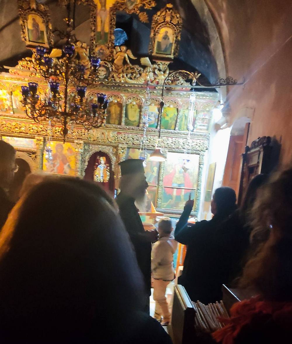 Μέσα σε κλίμα κατάνυξης παρακολουθήσαμε την Ακολουθία του Εσπερινού στον Ι. Ναό των Μυροφόρων. Στην συνέχεια μεταβήκαμε στο Καθολικό της Μονής, αφιερωμένο στους Παμμεγίστους Ταξιάρχες, όπου μας υποδέχτηκε η Δ. Μοναχή και μας μίλησε για την ιστορία της Μονής. Συγκεκριμένα μας μίλησε, μεταξύ άλλων, για το επιχρυσωμένο ξυλόγλυπτο τέμπλο, την εικόνα του Ένθρονου  Χριστού στο τέμπλο κατασκευασμένη τον 17ο αιώνα από την Κρητική Σχολή Αγιογραφίας και την Αγία Τράπεζα κατασκευής του 1622.