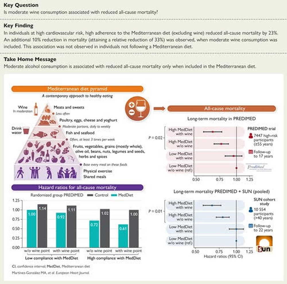 Σε δημοσιευμένη μελέτη του Φεβρουαρίου 2026 στο European Heart Journal, όσοι ακολουθούσαν σε μεγάλο βαθμό μια μεσογειακή διατροφή (συμπληρωμένη με εξαιρετικό παρθένο ελαιόλαδο) και κατανάλωναν μέτρια ποσότητα κρασιού (συνήθως ένα ποτήρι ημερησίως με τα γεύματα) εμφάνισαν 45% χαμηλότερο κίνδυνο καρδιαγγειακών παθήσεων σε σύγκριση με όσους δεν έπιναν κρασί στην ίδια ομάδα, με τα οφέλη να μειώνονται πέραν των τριών ποτηριών ημερησίως. Αυτή η σχετική μείωση του κινδύνου υπερβαίνει τις τυπικές επιδράσεις των στατινών (20-30% για σοβαρά καρδιαγγειακά επεισόδια ανά 1 mmol/L μείωση της LDL, σύμφωνα με μετα-αναλύσεις όπως η Cholesterol Treatment Trialists’ Collaboration), με τα οφέλη να δημιουργούνται σε ένα διατροφικό πλαίσιο για την πρωτογενή πρόληψη υψηλού κινδύνου.