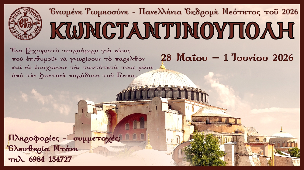 Ἡ Ἑνωμένη Ρωμηοσύνη ἀνακοινώνει τὴν Πανελλήνια Ἐκδρομὴ Νεότητος τοῦ 2026, στὴν καρδιὰ τῆς Ρωμηοσύνης καὶ τοῦ Βυζαντίου,  ἐκεῖ ὅπου ἡ Ἱστορία γίνεται μνήμη καὶ ἡ Πίστη ταυτότητα·