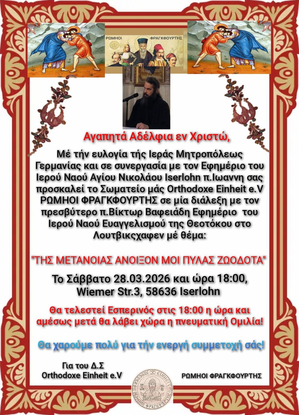 με την βοήθεια του Θεού οργανώνει το Σωματείο μάς Orthodoxe Einheit e.V ΡΩΜΗΟΙ ΦΡΑΓΚΦΟΥΡΤΗΣ και πάλι μια πνευματική Ομιλία στον Ιερό Ναό Αγίου Νικολάου Iserlohn! Ομιλητής θα είναι ο σεβαστός πρεσβύτερος π. Βίκτωρ Βαφειάδης.Θα χαρούμε πολύ για την ενεργή συμμετοχή σας!