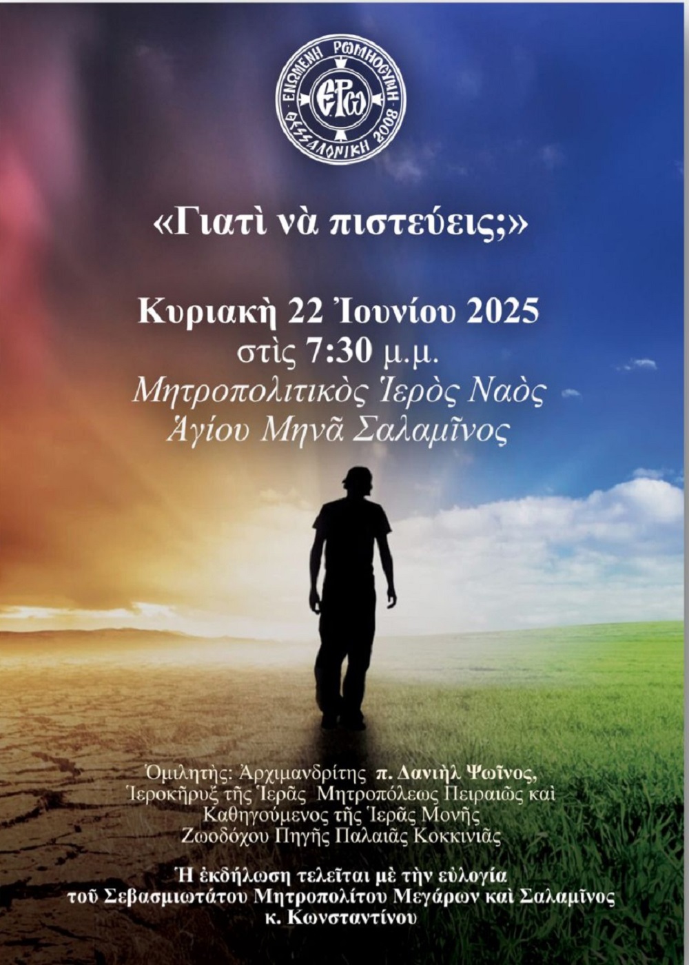 Μὲ τὴν εὐλογία τοῦ Σεβασμιωτάτου Μητροπολίτου μας Μεγάρων καὶ Σαλαμῖνος κ. Κωνσταντίνου τὸ κέντρο προβολῆς τῶν ἀξιῶν μας ΕΝΩΜΕΝΗ ΡΩΜΗΟΣΥΝΗ σᾶς προσκαλεῖ στὴν ἐκδήλωση ποὺ διοργανώνει τὴν Κυριακὴ 22 Ἰουνίου 2025 στὶς 7.30 μ.μ. στὸν Μητροπολιτικὸ Ἱερὸ Ναὸ Ἁγίου Μηνᾶ Σαλαμῖνος. Ὁμιλητὴς θὰ εἶναι ὁ Πανοσιολογιώτατος Ἀρχιμανδρίτης π. Δανιὴλ Ψωῖνος, Ἱεροκῆρυξ τῆς Ἱερᾶς Μητροπόλεως Πειραιῶς, καὶ Καθηγούμενος τῆς Ἱερᾶς Μονῆς Ζωοδόχου Πηγῆς Παλαιᾶς Κοκκινιᾶς μὲ θέμα: «Γιατί νὰ πιστεύεις;».