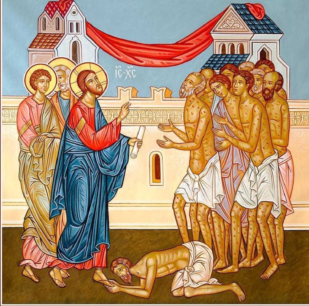 Πορευόμενος προς τα Ιεροσόλυμα κάποτε ο Χριστός διά μέσου των ορίων Γαλιλαίας και Σαμάρειας, πέρασε από ένα χωριό όπου συναντήθηκε καθ΄ οδόν με δέκα λεπρούς. Αποκλεισμένοι από την ανθρώπινη κοινωνία οι ταλαίπωροι εκείνοι, του φώναξαν δυνατά από μακριά να τους λυπηθεί. Και ο Χριστός, ελεήμων και φιλάνθρωπος, τους θεράπευσε (Κυριακή ΙΒ΄ Λουκά).