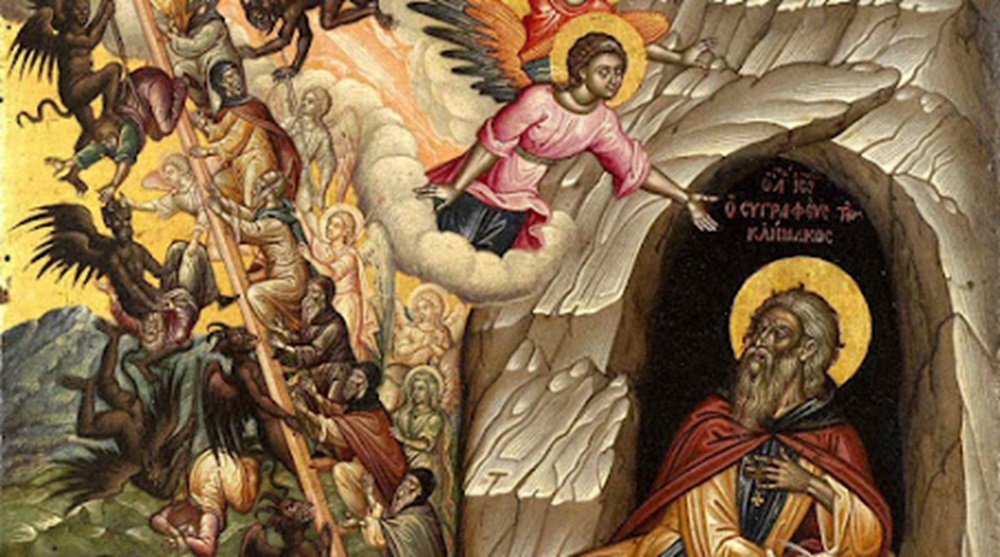 Ὁ Ἅγιος Ἰωάννης, στόν ὁποῖο ἡ Ἐκκλησία τιμητικά ἀφιερώνει τήν σημερινή τέταρτη Κυριακή τῶν Νηστειῶν, εἶναι ὁ συγγραφέας τοῦ βιβλίου τῆς «Κλίμακος», τῆς σκάλας δηλαδή τῶν διαδοχικῶν βαθμίδων μέχρι τήν ἄνοδο στόν ἀγωνοθέτη Χριστό. Στό βιβλίο του γίνεται μνεία τῆς ὑπακοῆς, τῆς μνήμης τοῦ θανάτου, τῆς ἀοργησίας, τῆς ἁγνείας, τῆς ἔλλειψης μνησικακίας, καταλαλιᾶς, ψεύδους, φιλαργυρίας, ὑπερηφάνειας κλπ ὡς βήματα κάθαρσης καί ἀνόδου πρός τό θεῖον. Ἡ ἕσχατη ἀρετή πού κατακτᾶται εἶναι ἡ ἀνιδιοτελής καί πρός τούς πάντας ἀγάπη, τό σημεῖο τῆς ἐγκατοίκησης τοῦ Θεοῦ στόν ἄνθρωπο. Ἡ βάση τῶν ἀρετῶν εἶναι ἡ ὑψοποιός ταπείνωση μαζύ μέ τήν διαρκῆ μετάνοια πού ἀναφέρεται ὡς «ἀνανέωση τοῦ βαπτίσματος καί ἀποκήρυξη τῆς ἀπελπισίας».