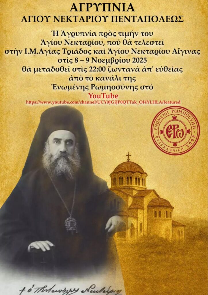 Η αγρυπνία στον ιερό ναό Αγίου Νεκταρίου στην Αίγινα θα μεταδοθεί ζωντανά από το κανάλι της Ενωμένης Ρωμηοσύνης στο YouTube το βράδυ της ογδόης Νοεμβρίου έως τα ξημερώματα της ενάτης. Μια νύχτα γεμάτη φως από τον τόπο των θαυμάτων.