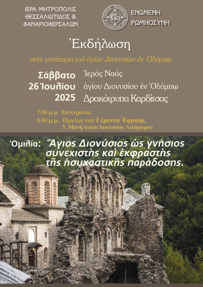 Η Ιερά Μητρόπολις Θεσσαλιώτιδος & Φαναριφερσάλων, σε συνεργασία με το Σωματείο Ενωμένη Ρωμηοσύνη, σας προσκαλεί στις στις 26 Ιουλίου και ημέρα Σάββατο, στον Ιερό Ναό Αγίου Διονυσίου εν Ολύμπο στην Δρακότρυπα Καρδίτσας και ώρα 19:30 το απόγευμα όπου θα λάβει ΄χωρα η ομιλία του γέροντα Εφραίμ με θέμα : Ο Άγιος Διονύσιος ως γνήσιος συνεχιστής και εκφραστής της Ησυχαστικής Παράδοσης .