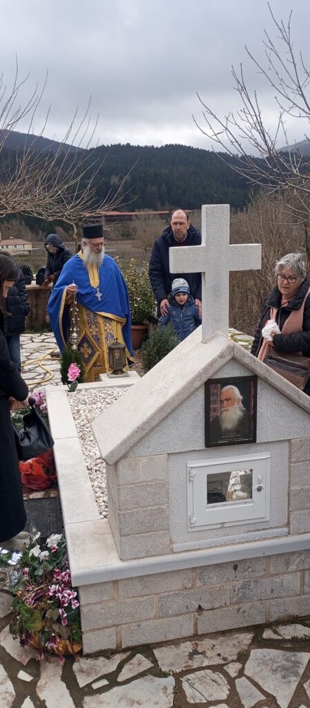 Στο δυτικό περίβολο του ναού βρίσκεται ο τάφος του γέροντα, όπου τελέστηκε τρισάγιο στη μνήμη του, προσκυνήσαμε και παρακαλέσαμε να πρεσβεύει υπέρ ημών, όπως και ο ίδιος είχε προτρέψει εν ζωή να πράττουμε μετά την κοίμηση του και συνολικά της Ρωμηοσύνης που τόσο αγαπούσε. Ο λόφος που επέλεξε ο π. Ανανίας για να κατασκευαστεί ο ναός και ο τάφος, προσφέρει μια εκπληκτική θέα από τα 1000 μέτρα υψόμετρο, λίγα μέτρα πάνω από το πατρικό του σπίτι, όπου μας προσφέρθηκε και φέτος, εξαιρετική φιλοξενία που συνοδεύτηκε από πλούσιο κέρασμα, κατά τη διάρκεια του οποίου κατατέθηκαν από τα παρευρισκόμενα πνευματικά του παιδιά, προσωπικά βιώματα για τον γέροντα, που ενίσχυσαν και ωφέλησαν άπαντες.