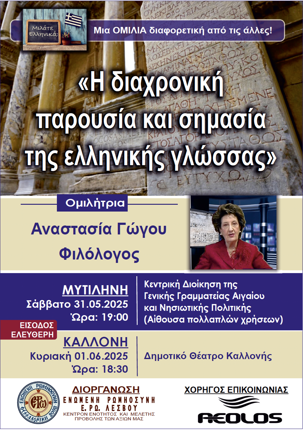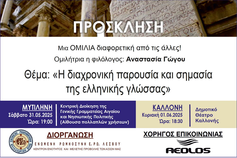 Η Ενωμένη Ρωμηοσύνη διοργανώνει εκδήλωση στη Μυτιλήνη το Σάββατο 31.05.2025 και ώρα: 19:00 στην Αίθουσα της Κεντρικής Διοίκησης της Γενικής Γραμματείας Αιγαίου και Νησιωτικής Πολιτικής (Αίθουσα πολλαπλών χρήσεων), ομιλία με θέμα: