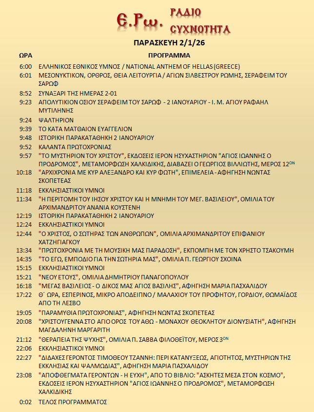 02/01/26 – Πρόγραμμα Λειτουργίας Ραδιοφώνου ΕΡΩ: “Ε.Ρω. – ΡαδιοΣυχνότητα”
