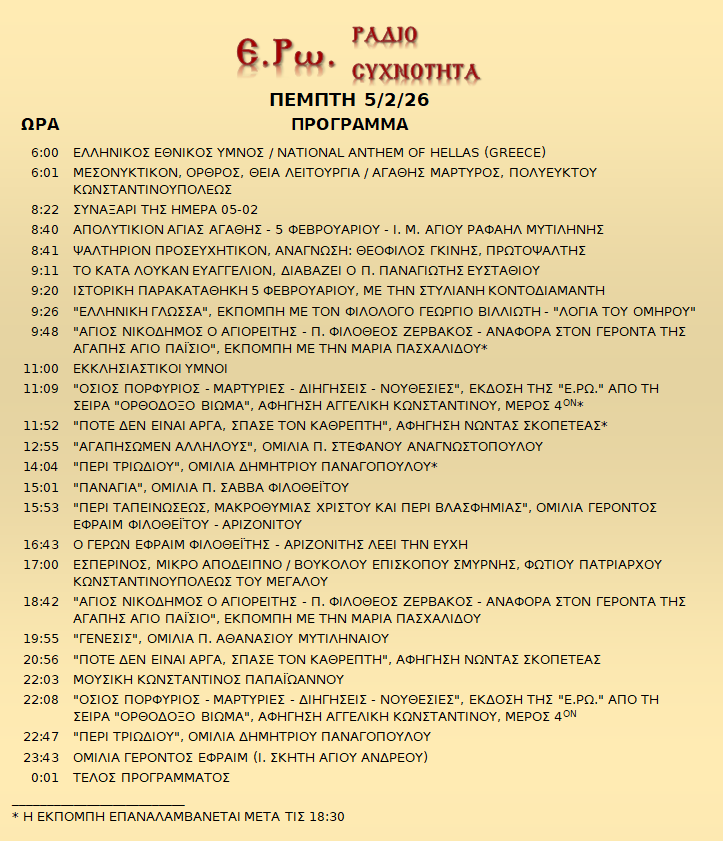 5 Φεβρουαρίου 2026 σε ΑΡΧΕΙΑ ΗΧΟΥ, ΕΡΩ - ΡαδιοΣυχνότητα, ΟΠΤΙΚΟΑΚΟΥΣΤΙΚΟ ΥΛΙΚΟ Σήμερα 05/02/26, μπορείτε να ακούσετε: Γιὰ τὴ σύνδεση μπορεῖτε νὰ πατήστε στην παρακάτω εικόνα : ή χρησιμοποιήσετε τὸ παρακάτω link : Πρόγραμμα Λειτουργίας Ραδιοφώνου ΕΡΩ: “Ε.Ρω. – ΡαδιοΣυχνότητα”https://welove.radio/radio/ero-radiosixnotita/ Καλή σας ακρόαση Ετικέτες - Σχετικά Θέματα ΕΡΩ ΡΑΔΙΟΦΩΝΟ ΕΡΩ-ΡΑΔΙΟΣΥΧΝΟΤΗΤΑ Προηγούμενο