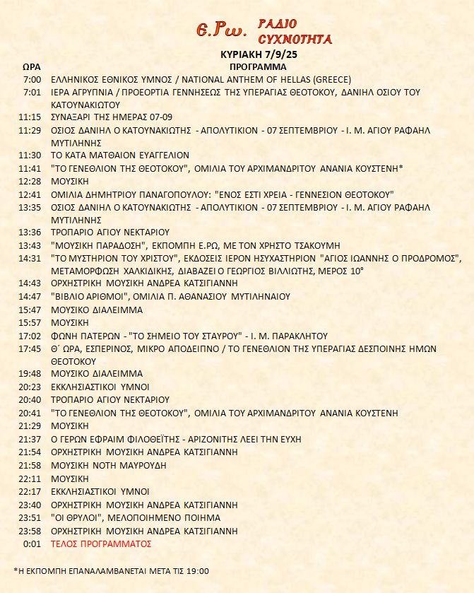 7 Σεπτεμβρίου 2025 σε ΑΡΧΕΙΑ ΗΧΟΥ, ΕΡΩ - ΡαδιοΣυχνότητα, ΟΠΤΙΚΟΑΚΟΥΣΤΙΚΟ ΥΛΙΚΟ Σήμερα 07/9/25, μπορείτε να ακούσετε : Γιὰ τὴ σύνδεση μπορεῖτε νὰ πατήστε στην παρακάτω εικόνα : ή χρησιμοποιήσετε τὸ παρακάτω link : Πρόγραμμα Λειτουργίας Ραδιοφώνου ΕΡΩ: “Ε.Ρω. – ΡαδιοΣυχνότητα”https://welove.radio/radio/ero-radiosixnotita/ Καλή σας ακρόαση Ετικέτες - Σχετικά Θέματα ΕΡΩ ΡΑΔΙΟΦΩΝΟ ΕΡΩ-ΡΑΔΙΟΣΥΧΝΟΤΗΤΑ Προηγούμενο
