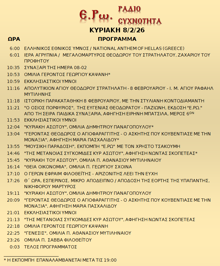 8 Φεβρουαρίου 2026 σε ΑΡΧΕΙΑ ΗΧΟΥ, ΕΡΩ - ΡαδιοΣυχνότητα, ΟΠΤΙΚΟΑΚΟΥΣΤΙΚΟ ΥΛΙΚΟ Σήμερα 08/02/26, μπορείτε να ακούσετε: Γιὰ τὴ σύνδεση μπορεῖτε νὰ πατήστε στην παρακάτω εικόνα : ή χρησιμοποιήσετε τὸ παρακάτω link : Πρόγραμμα Λειτουργίας Ραδιοφώνου ΕΡΩ: “Ε.Ρω. – ΡαδιοΣυχνότητα”https://welove.radio/radio/ero-radiosixnotita/ Καλή σας ακρόαση Ετικέτες - Σχετικά Θέματα ΕΡΩ ΡΑΔΙΟΦΩΝΟ ΕΡΩ-ΡΑΔΙΟΣΥΧΝΟΤΗΤΑ Προηγούμενο