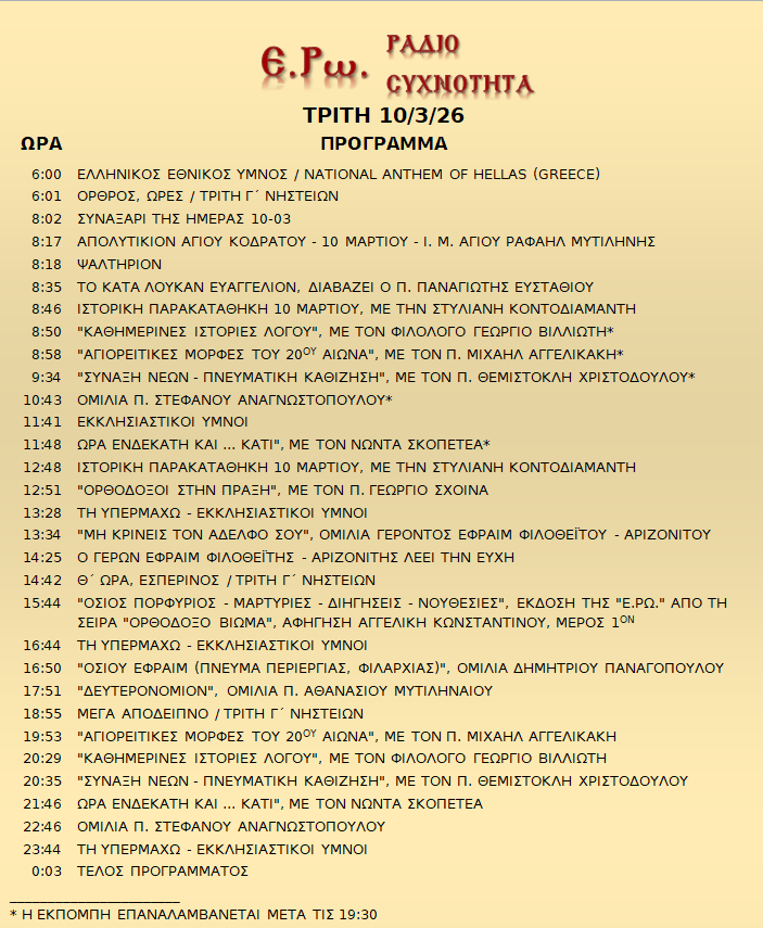 10 Μαρτίου 2026 σε ΑΡΧΕΙΑ ΗΧΟΥ, ΕΡΩ - ΡαδιοΣυχνότητα, ΟΠΤΙΚΟΑΚΟΥΣΤΙΚΟ ΥΛΙΚΟ Σήμερα 10/03/26, μπορείτε να ακούσετε: Γιὰ τὴ σύνδεση μπορεῖτε νὰ πατήστε στην παρακάτω εικόνα : ή χρησιμοποιήσετε τὸ παρακάτω link : Πρόγραμμα Λειτουργίας Ραδιοφώνου ΕΡΩ: “Ε.Ρω. – ΡαδιοΣυχνότητα”https://welove.radio/radio/ero-radiosixnotita/ Καλή σας ακρόαση Ετικέτες - Σχετικά Θέματα ΕΡΩ ΡΑΔΙΟΦΩΝΟ ΕΡΩ-ΡΑΔΙΟΣΥΧΝΟΤΗΤΑ Προηγούμενο