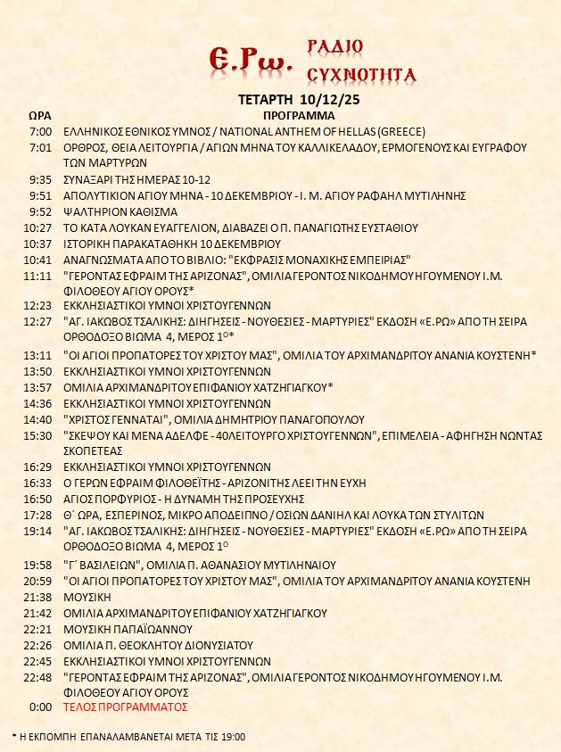 10 Δεκεμβρίου 2025 σε ΑΡΧΕΙΑ ΗΧΟΥ, ΕΡΩ - ΡαδιοΣυχνότητα, ΟΠΤΙΚΟΑΚΟΥΣΤΙΚΟ ΥΛΙΚΟ Σήμερα 10/12/25, μπορείτε να ακούσετε: Γιὰ τὴ σύνδεση μπορεῖτε νὰ πατήστε στην παρακάτω εικόνα : ή χρησιμοποιήσετε τὸ παρακάτω link : Πρόγραμμα Λειτουργίας Ραδιοφώνου ΕΡΩ: “Ε.Ρω. – ΡαδιοΣυχνότητα”https://welove.radio/radio/ero-radiosixnotita/ Καλή σας ακρόαση Ετικέτες - Σχετικά Θέματα ΕΡΩ ΡΑΔΙΟΦΩΝΟ ΕΡΩ-ΡΑΔΙΟΣΥΧΝΟΤΗΤΑ Προηγούμενο