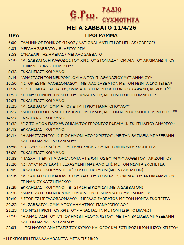 11/04/26 – Πρόγραμμα Λειτουργίας Ραδιοφώνου ΕΡΩ: “Ε.Ρω. – ΡαδιοΣυχνότητα”