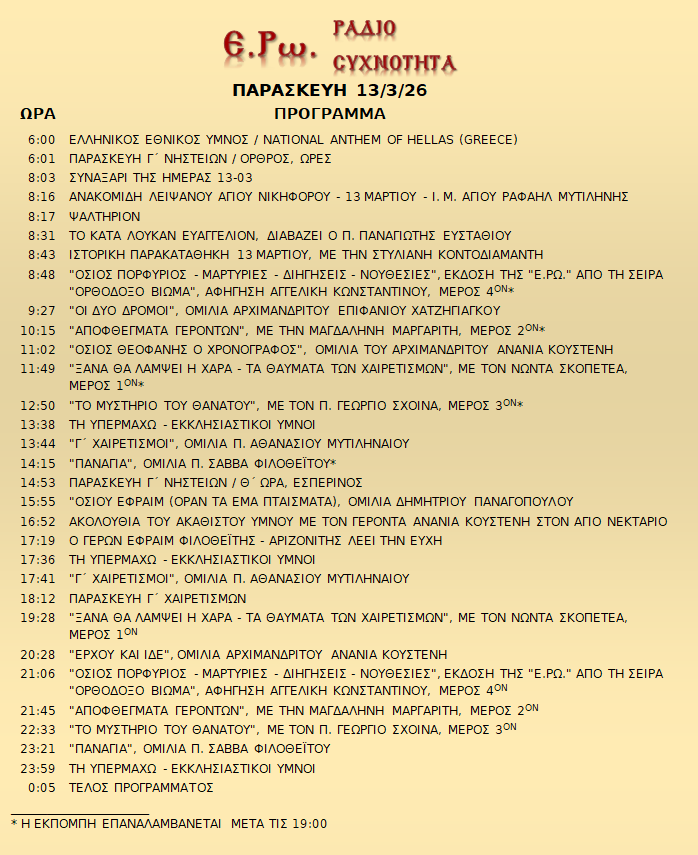 13/03/26 – Πρόγραμμα Λειτουργίας Ραδιοφώνου ΕΡΩ: “Ε.Ρω. – ΡαδιοΣυχνότητα”
