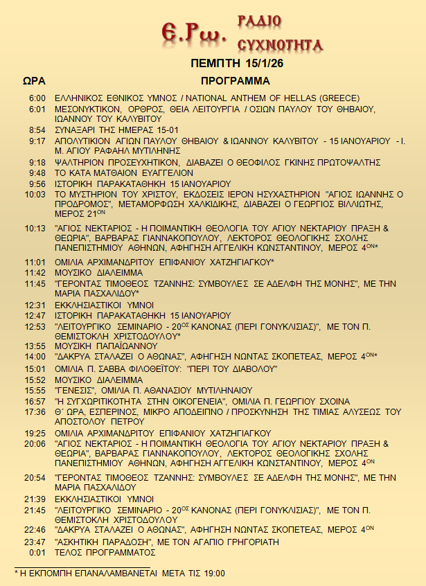 Σήμερα 15/01/26, μπορείτε να ακούσετε: