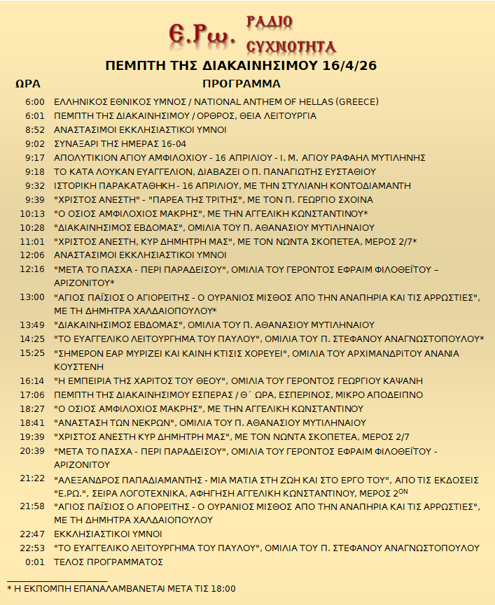 16/04/26 – Πρόγραμμα Λειτουργίας Ραδιοφώνου ΕΡΩ: “Ε.Ρω. – ΡαδιοΣυχνότητα”