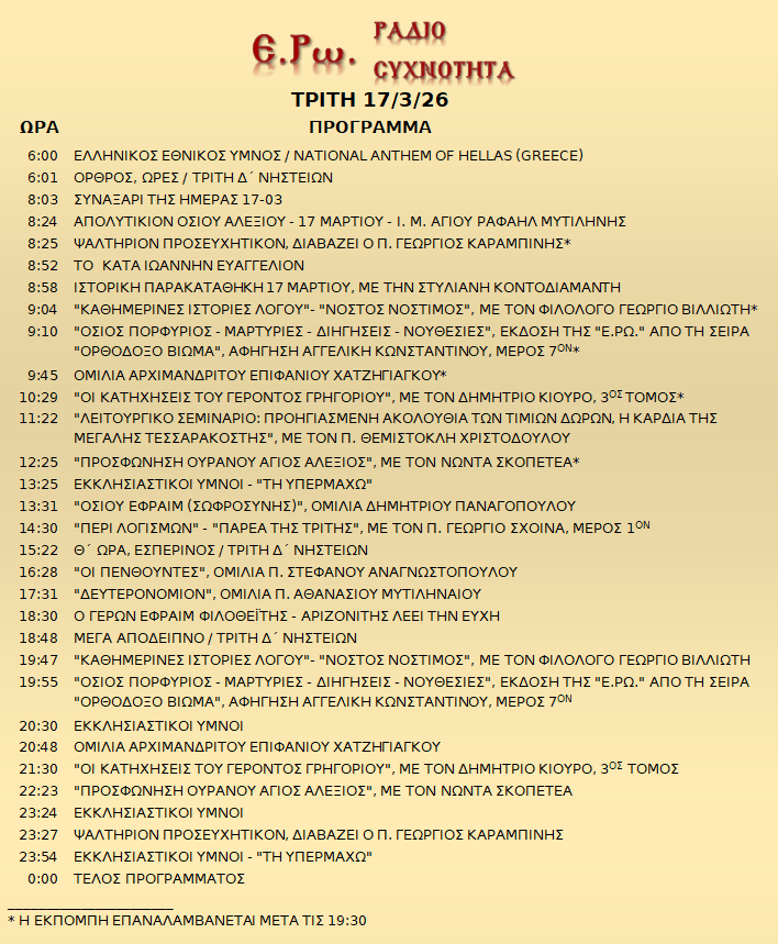 17/03/26 – Πρόγραμμα Λειτουργίας Ραδιοφώνου ΕΡΩ: “Ε.Ρω. – ΡαδιοΣυχνότητα”