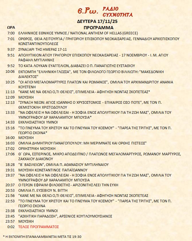 17/11/25 – Πρόγραμμα Λειτουργίας Ραδιοφώνου ΕΡΩ: “Ε.Ρω. – ΡαδιοΣυχνότητα”