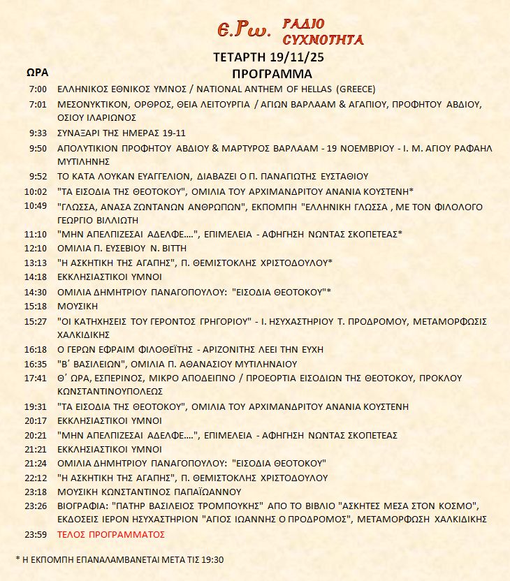 19 Νοεμβρίου 2025 σε ΑΡΧΕΙΑ ΗΧΟΥ, ΕΡΩ - ΡαδιοΣυχνότητα, ΟΠΤΙΚΟΑΚΟΥΣΤΙΚΟ ΥΛΙΚΟ Σήμερα 19/11/25, μπορείτε να ακούσετε: Γιὰ τὴ σύνδεση μπορεῖτε νὰ πατήστε στην παρακάτω εικόνα : ή χρησιμοποιήσετε τὸ παρακάτω link : Πρόγραμμα Λειτουργίας Ραδιοφώνου ΕΡΩ: “Ε.Ρω. – ΡαδιοΣυχνότητα”https://welove.radio/radio/ero-radiosixnotita/ Καλή σας ακρόαση Ετικέτες - Σχετικά Θέματα ΕΡΩ ΡΑΔΙΟΦΩΝΟ ΕΡΩ-ΡΑΔΙΟΣΥΧΝΟΤΗΤΑ Προηγούμενο