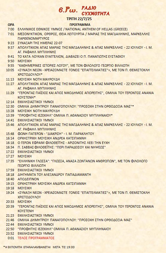 22/7/25 – Πρόγραμμα Λειτουργίας Ραδιοφώνου ΕΡΩ: “Ε.Ρω. – ΡαδιοΣυχνότητα”