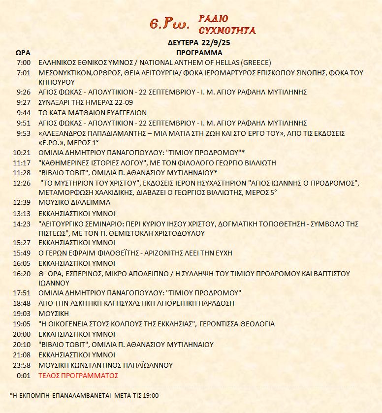 22 Σεπτεμβρίου 2025 σε ΑΡΧΕΙΑ ΗΧΟΥ, ΕΡΩ - ΡαδιοΣυχνότητα, ΟΠΤΙΚΟΑΚΟΥΣΤΙΚΟ ΥΛΙΚΟ Σήμερα 22/9/25, μπορείτε να ακούσετε : Γιὰ τὴ σύνδεση μπορεῖτε νὰ πατήστε στην παρακάτω εικόνα : ή χρησιμοποιήσετε τὸ παρακάτω link : Πρόγραμμα Λειτουργίας Ραδιοφώνου ΕΡΩ: “Ε.Ρω. – ΡαδιοΣυχνότητα”https://welove.radio/radio/ero-radiosixnotita/ Καλή σας ακρόαση Ετικέτες - Σχετικά Θέματα ΕΡΩ ΡΑΔΙΟΦΩΝΟ ΕΡΩ-ΡΑΔΙΟΣΥΧΝΟΤΗΤΑ Προηγούμενο