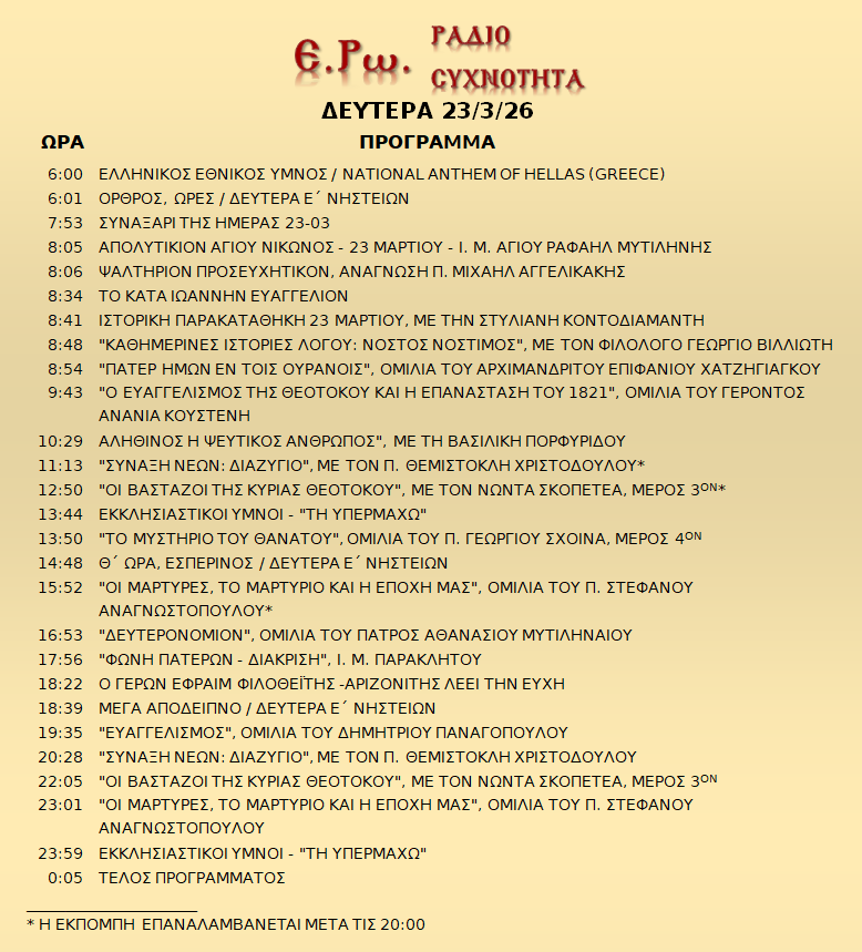23 Μαρτίου 2026 σε ΑΡΧΕΙΑ ΗΧΟΥ, ΕΡΩ - ΡαδιοΣυχνότητα, ΟΠΤΙΚΟΑΚΟΥΣΤΙΚΟ ΥΛΙΚΟ Σήμερα 23/03/26, μπορείτε να ακούσετε: Γιὰ τὴ σύνδεση μπορεῖτε νὰ πατήστε στην παρακάτω εικόνα : ή χρησιμοποιήσετε τὸ παρακάτω link : Πρόγραμμα Λειτουργίας Ραδιοφώνου ΕΡΩ: “Ε.Ρω. – ΡαδιοΣυχνότητα”https://welove.radio/radio/ero-radiosixnotita/ Καλή σας ακρόαση Ετικέτες - Σχετικά Θέματα ΕΡΩ ΡΑΔΙΟΦΩΝΟ ΕΡΩ-ΡΑΔΙΟΣΥΧΝΟΤΗΤΑ Προηγούμενο