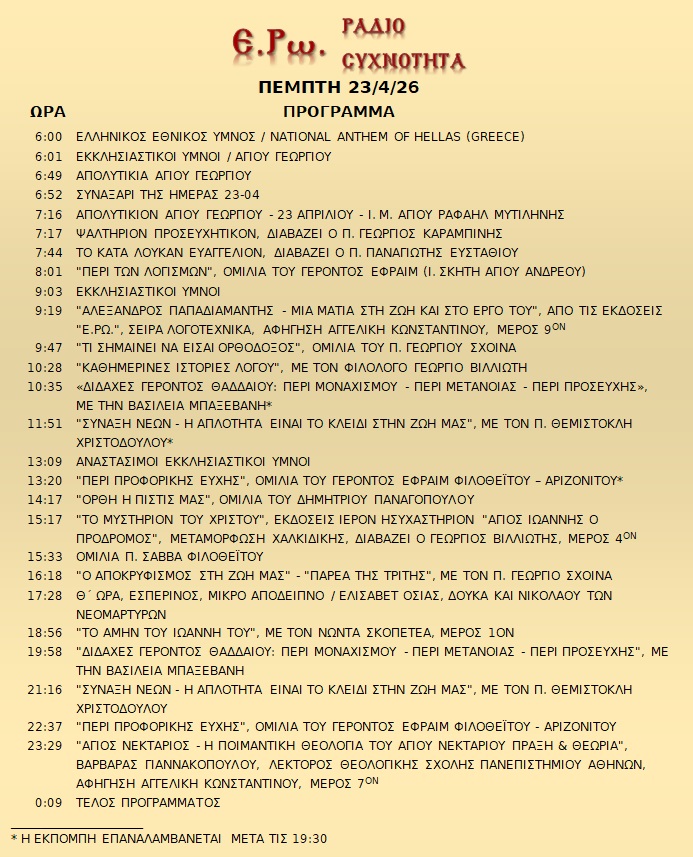 23 Απριλίου 2026 σε ΑΡΧΕΙΑ ΗΧΟΥ, ΕΡΩ - ΡαδιοΣυχνότητα, ΟΠΤΙΚΟΑΚΟΥΣΤΙΚΟ ΥΛΙΚΟ Σήμερα 23/4/26, μπορείτε να ακούσετε : Γιὰ τὴ σύνδεση μπορεῖτε νὰ πατήστε στην παρακάτω εικόνα : ή χρησιμοποιήσετε τὸ παρακάτω link : https://welove.radio/radio/ero-radiosixnotita/ Καλή σας ακρόαση Ετικέτες - Σχετικά Θέματα ΕΡΩ ΡΑΔΙΟΦΩΝΟ ΕΡΩ-ΡΑΔΙΟΣΥΧΝΟΤΗΤΑ Προηγούμενο