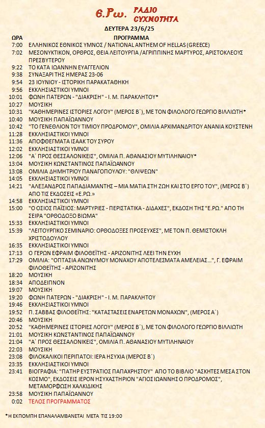 23/6/25 – Πρόγραμμα Λειτουργίας Ραδιοφώνου ΕΡΩ: “Ε.Ρω. – ΡαδιοΣυχνότητα”