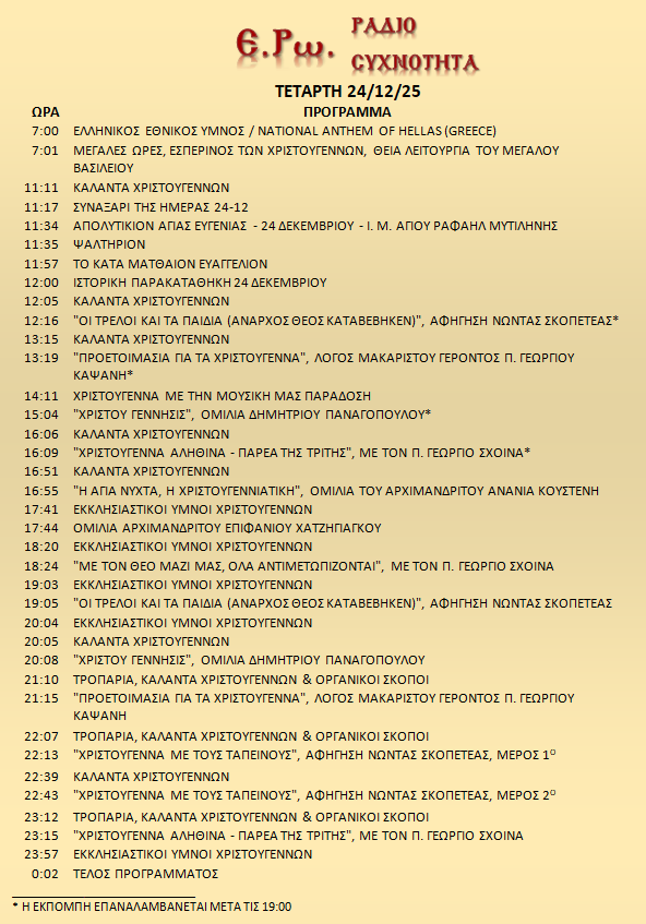 24 Δεκεμβρίου 2025 σε ΑΡΧΕΙΑ ΗΧΟΥ, ΕΡΩ - ΡαδιοΣυχνότητα, ΟΠΤΙΚΟΑΚΟΥΣΤΙΚΟ ΥΛΙΚΟ Σήμερα 24/12/25, μπορείτε να ακούσετε: Γιὰ τὴ σύνδεση μπορεῖτε νὰ πατήστε στην παρακάτω εικόνα : ή χρησιμοποιήσετε τὸ παρακάτω link : Πρόγραμμα Λειτουργίας Ραδιοφώνου ΕΡΩ: “Ε.Ρω. – ΡαδιοΣυχνότητα”https://welove.radio/radio/ero-radiosixnotita/ Καλή σας ακρόαση Ετικέτες - Σχετικά Θέματα ΕΡΩ ΡΑΔΙΟΦΩΝΟ ΕΡΩ-ΡΑΔΙΟΣΥΧΝΟΤΗΤΑ Προηγούμενο