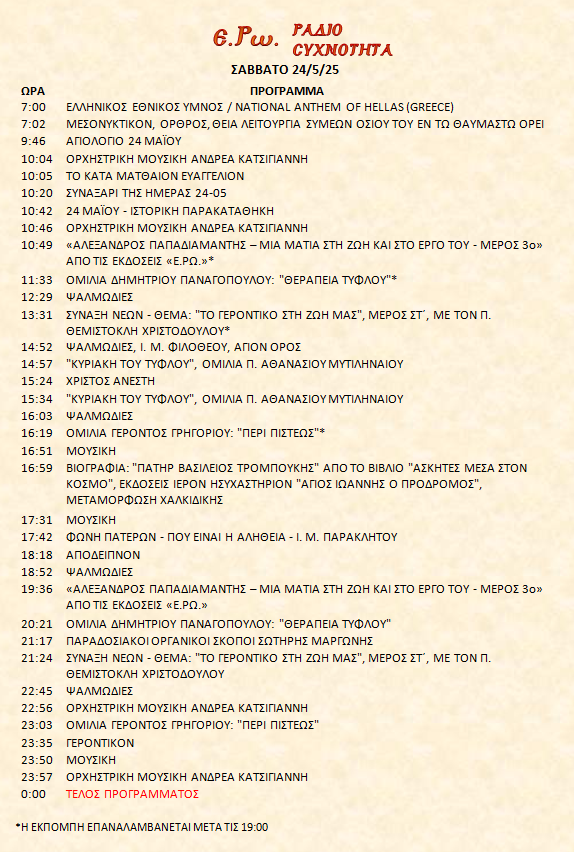 Σήμερα 24/5/25,  μπορείτε να ακούσετε :