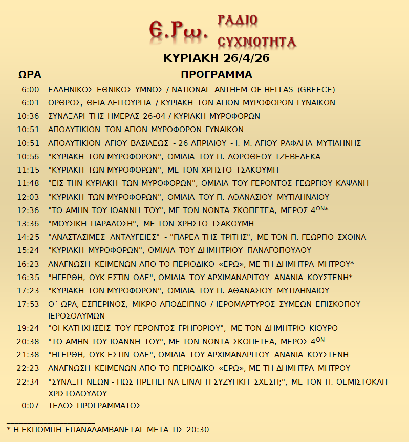 26 Απριλίου 2026 σε ΑΡΧΕΙΑ ΗΧΟΥ, ΕΡΩ - ΡαδιοΣυχνότητα, ΟΠΤΙΚΟΑΚΟΥΣΤΙΚΟ ΥΛΙΚΟ Σήμερα 26/4/26, μπορείτε να ακούσετε : Γιὰ τὴ σύνδεση μπορεῖτε νὰ πατήστε στην παρακάτω εικόνα : ή χρησιμοποιήσετε τὸ παρακάτω link : https://welove.radio/radio/ero-radiosixnotita/ Καλή σας ακρόαση Ετικέτες - Σχετικά Θέματα ΕΡΩ ΡΑΔΙΟΦΩΝΟ ΕΡΩ-ΡΑΔΙΟΣΥΧΝΟΤΗΤΑ Προηγούμενο