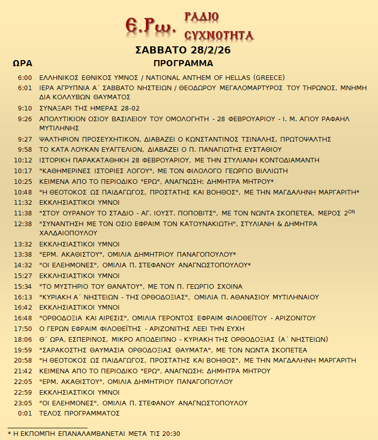 28 Φεβρουαρίου 2026 σε ΑΡΧΕΙΑ ΗΧΟΥ, ΕΡΩ - ΡαδιοΣυχνότητα, ΟΠΤΙΚΟΑΚΟΥΣΤΙΚΟ ΥΛΙΚΟ Σήμερα 28/02/26, μπορείτε να ακούσετε: Γιὰ τὴ σύνδεση μπορεῖτε νὰ πατήστε στην παρακάτω εικόνα : ή χρησιμοποιήσετε τὸ παρακάτω link : Πρόγραμμα Λειτουργίας Ραδιοφώνου ΕΡΩ: “Ε.Ρω. – ΡαδιοΣυχνότητα”https://welove.radio/radio/ero-radiosixnotita/ Καλή σας ακρόαση Ετικέτες - Σχετικά Θέματα ΕΡΩ ΡΑΔΙΟΦΩΝΟ ΕΡΩ-ΡΑΔΙΟΣΥΧΝΟΤΗΤΑ Προηγούμενο